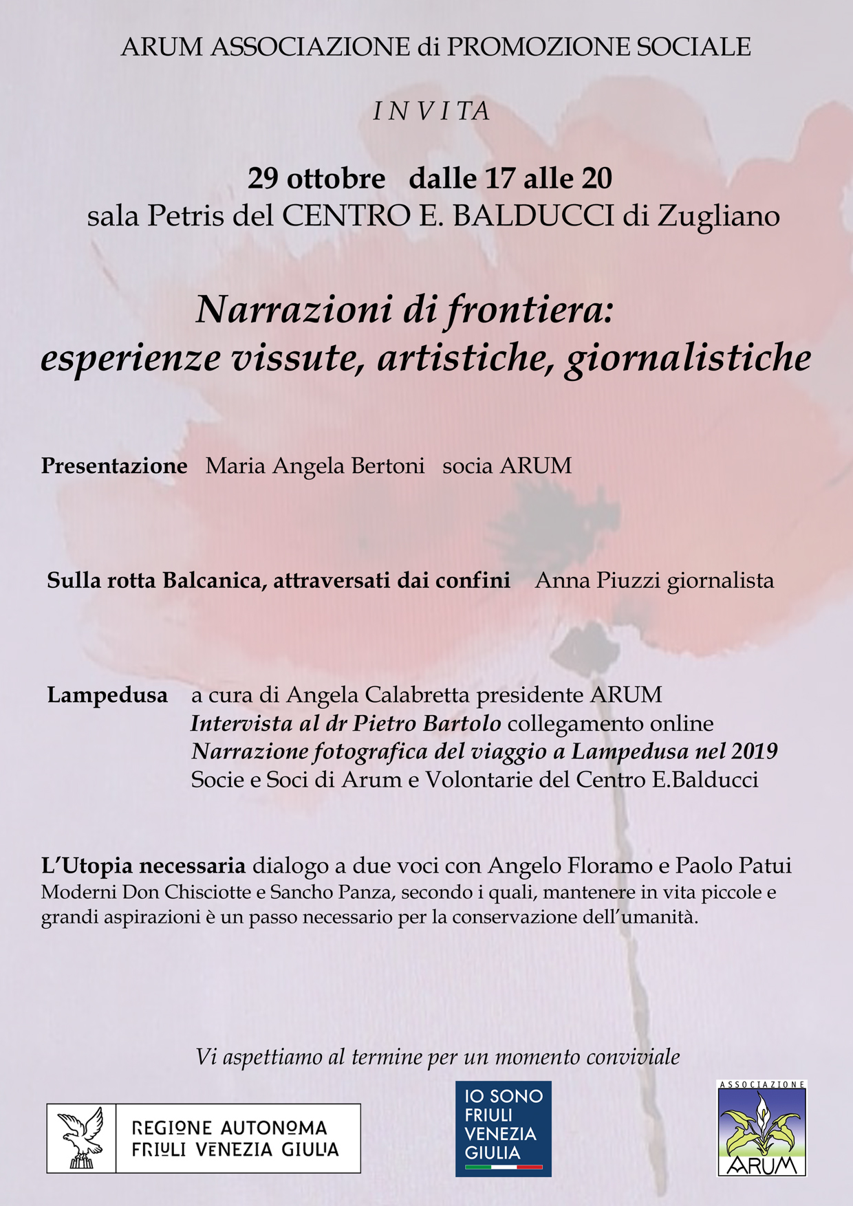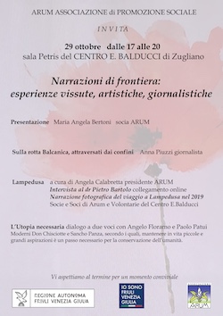 Presentazione Maria Angela Bertoni socia ARUM Sulla rotta Balcanica, attraversati dai confini Anna Piuzzi giornalista Lampedusa a cura di Angela Calabretta presidente ARUM Intervista al dr Pietro Bartolo collegamento online Narrazione fotografica del viaggio a Lampedusa nel 2019 Socie e Soci di Arum e Volontarie del Centro E.Balducci L'Utopia necessaria dialogo a due voci con Angelo Floramo e Paolo Patui. Moderni Don Chisciotte e Sancho Panza, secondo i quali, mantenere in vita piccole e grandi aspirazioni è un passo necessario per la conservazione dell'umanità. Vi aspettiamo al termine per un momento conviviale
