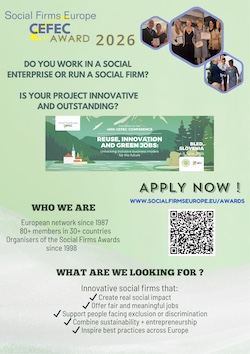 Invitiamo tutte le imprese e cooperative sociali interessate a prendere visione della "Call for Applications per il SFE CEFEC Award 2026". È un’importante occasione per valorizzare e condividere a livello europeo buone pratiche capaci di generare impatto sociale, promuovere lavoro inclusivo e coniugare sostenibilità e imprenditorialità. Le candidature possono essere presentate . compilando il modulo online entro il 10 aprile 2026 >