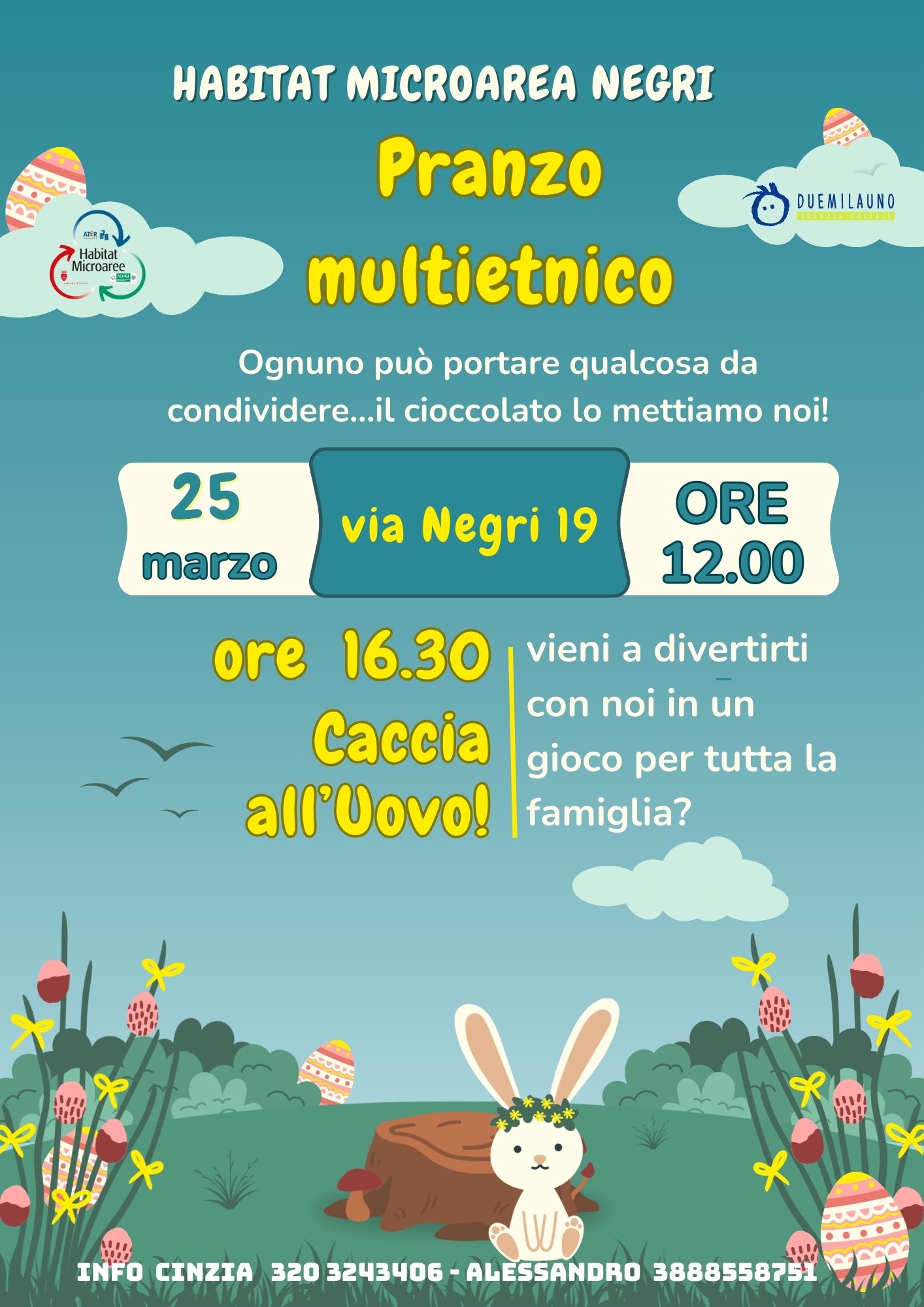 Mercoledì 25 marzo HM NEGRI ore 12.30 Pranzo Sociale e Multietnico in occasione delle feste pasquali. ore 16.30 Festa Caccia all'uovo via Negri 19