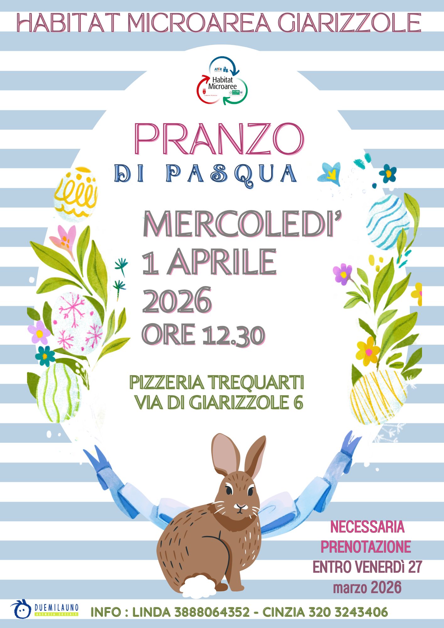 Mercoledì 1 aprile HM GIARIZZOLE ore 12.30 Pranzo Sociale di Pasqua Pizzeria Trequarti Via di Giarizzole 6