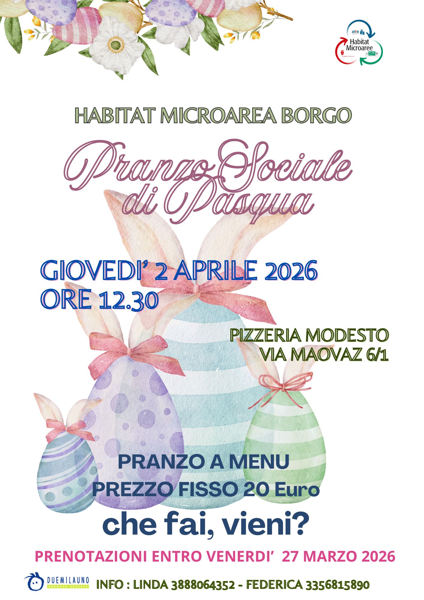 Dalla prossima settimana nel territorio delle sedi Habitat Microaree cominciano le occasioni di incontro per celebrare assieme la pasqua : incontri, caccia all'uovo, pranzi sociali.